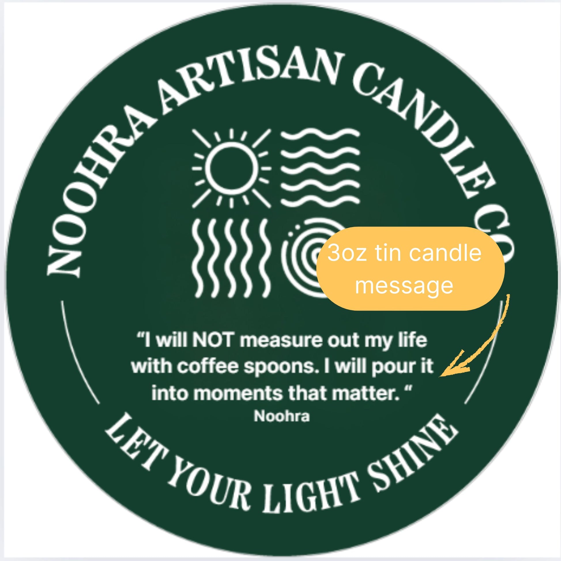 3oz Tin Candle: Housed in a rose gold tin, it features a single wick for a clean, focused burn—perfect for travel, gifting, or personal pause. The message is printed on the lid—a positive quote chosen to uplift and affirm.