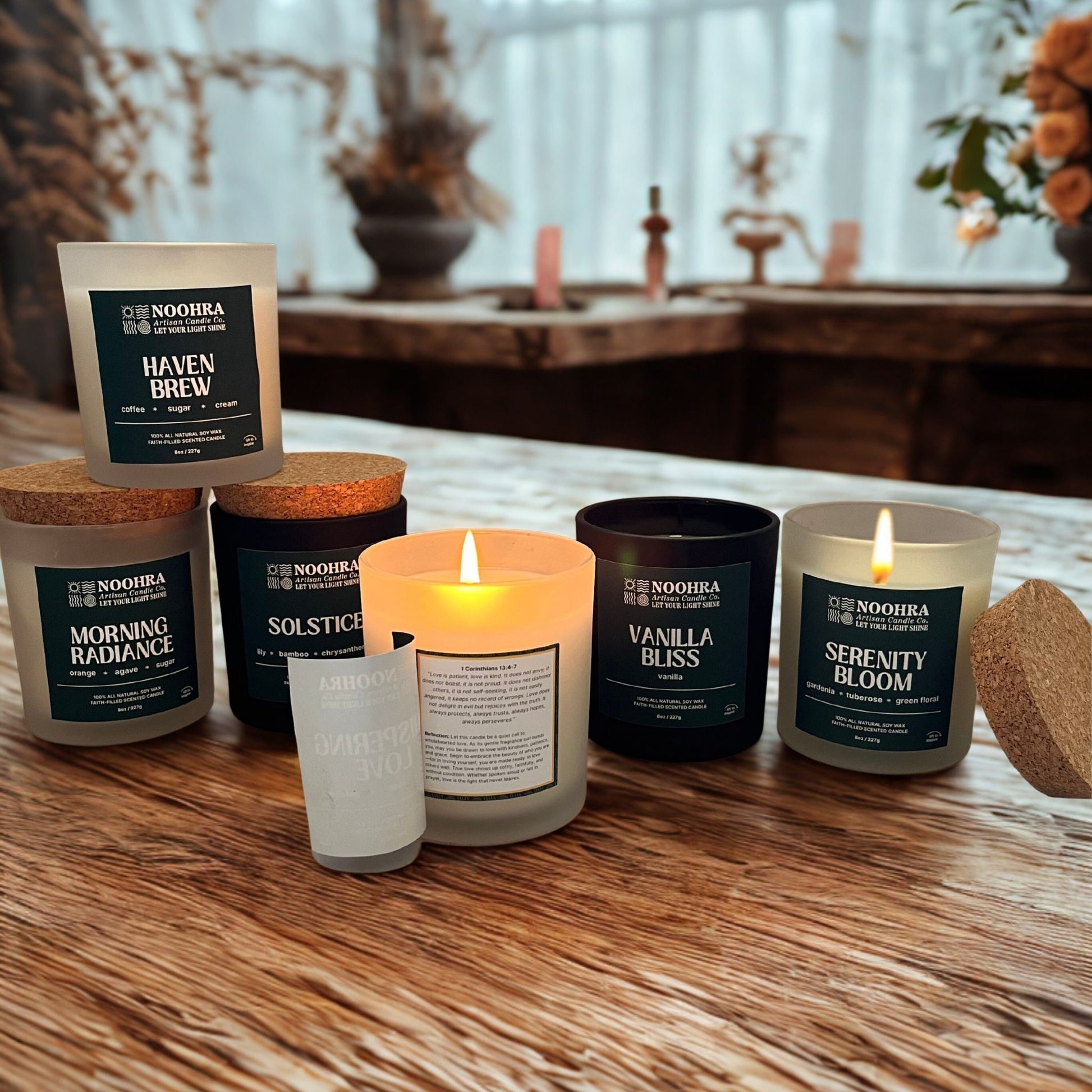 Each candle is hand-poured with care and carries Noohra’s signature Lift to Inspire label, revealing a hidden layer beneath the surface: a carefully chosen Bible verse paired with a gentle devotional reflection. Whether gifted or kept close, Solstice whispers, "There is a time for everything and a season for every activity under the heavens."