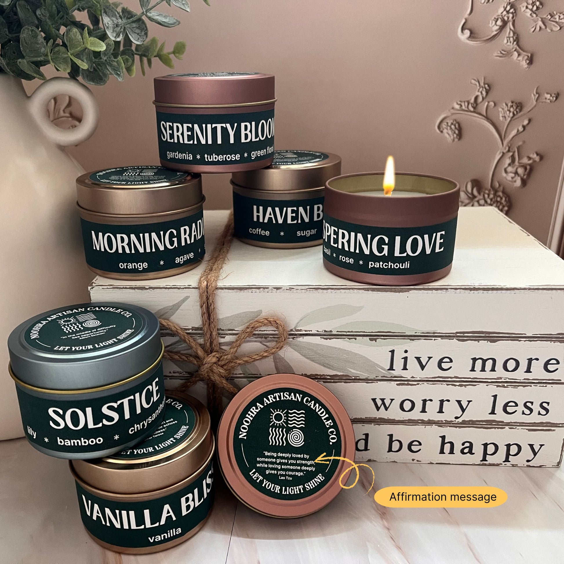 3oz Tin Candle: Housed in a rose gold tin, it features a single wick for a clean, focused burn—perfect for travel, gifting, or personal pause. The message is printed on the lid—a positive quote chosen to uplift and affirm.